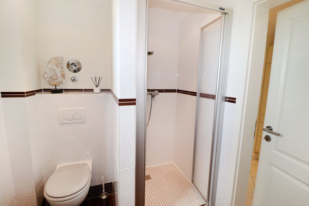 Dusche, Waschbecken, WC. Terrasse mit Stühle/Tisch, Strandkorb.